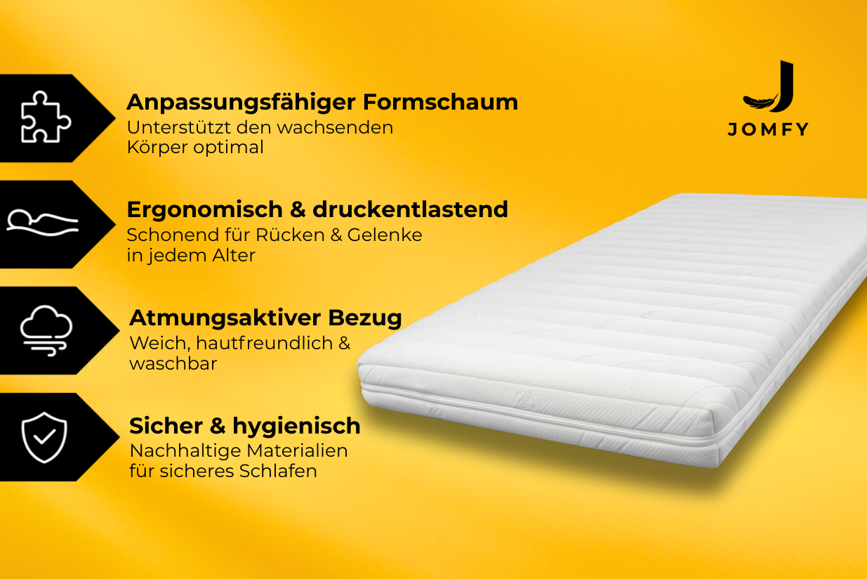 Die JOMFY Child Matratze sorgt mit hochwertigem Naturlatex für eine optimale ergonomische Anpassung an die Körperkonturen deines Kindes. Durch die punktgenaue Unterstützung wird die Wirbelsäule gesund gestützt, während gleichzeitig eine förderliche Durchblutung im Schlaf erhalten bleibt.