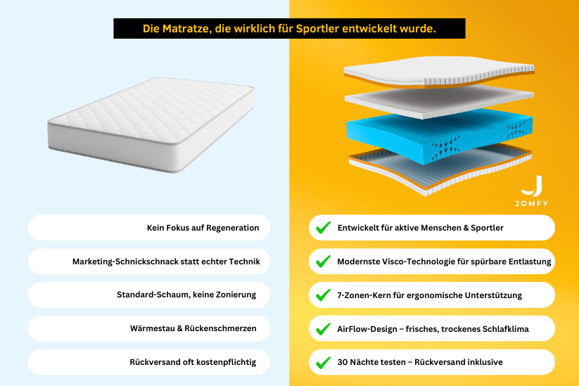 Mit JOMFY verbesserst du deine Schlafqualität spürbar: Unsere Matratzen und Kissen fördern die muskuläre Erholung, unterstützen die Regeneration nach dem Sport und helfen dir, langfristig mehr Energie und Leistungsfähigkeit zu gewinnen.